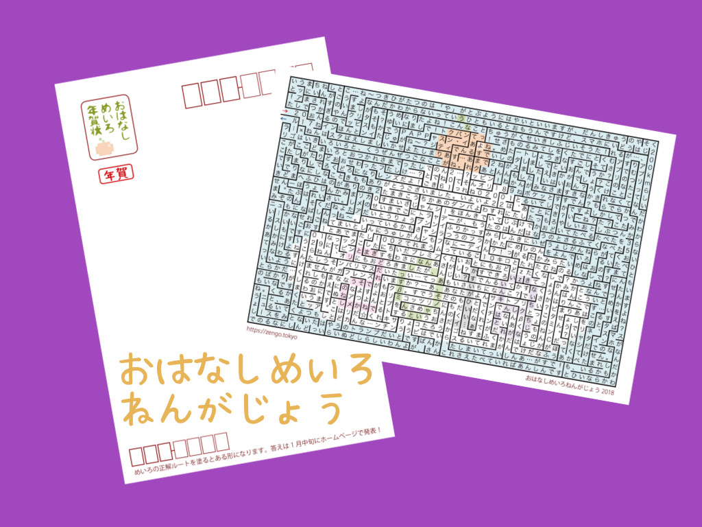 2018年版のおはなしめいろの年賀状です。2017年を振り返る盛りだくさんなおはなしめいろになっています。2018年1月中旬にホームページで答えを発表します。チャレンジしてみてください。サイズ:148mm x 100mm