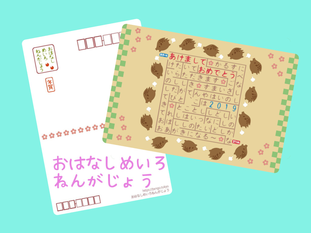 2019年版のおはなしめいろの年賀状です。ひらがな・カタカナのみを使用しているので、漢字の読めないお子さまでも楽しむことができます。2018年12月11日以降に発送の予定です。サイズ:148mm x 100mm